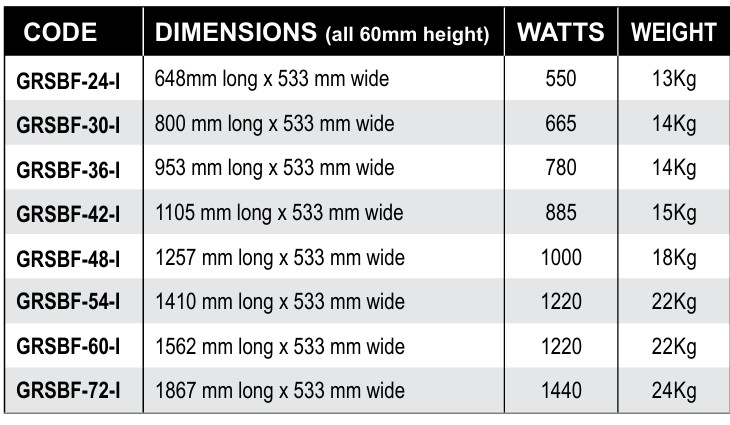 Satin Black hard coated aluminium finish with flush mount, for a smooth professional finish, includes remote temperature control and ON/OFF switch. Ideal for use on pass-through areas, buffet lines and as hors d’oeuvre displays. They feature a thermostatically-controlled blanket-type foil element heated surface to help hold your food hot and delicious with consistent temperatures across the shelf. Adjustable thermostat controls allow surface temperature for the GRSBF to range from 27°to 82°C.